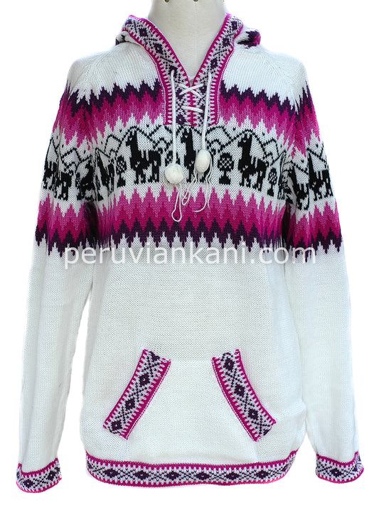 Alpaga à capuche blanc/bleu - Pull alpaga