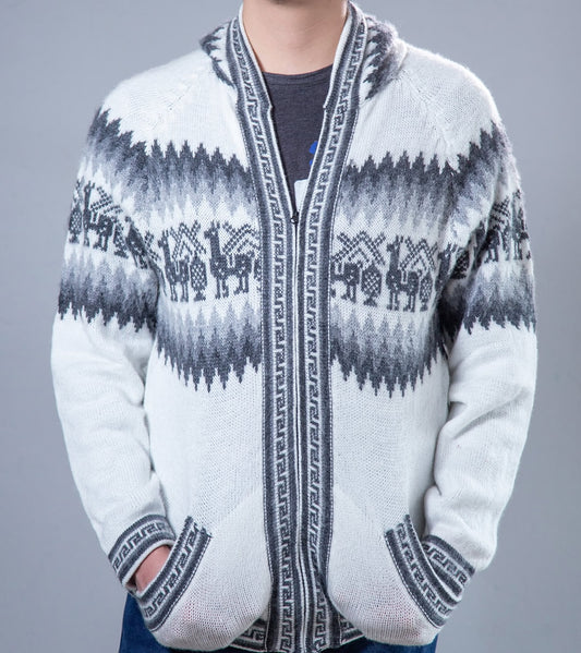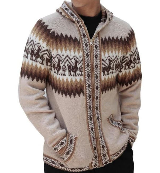 Mens Little Llamas Hooded Sweater Alpaca Wool Knitted Jacket Hoodie